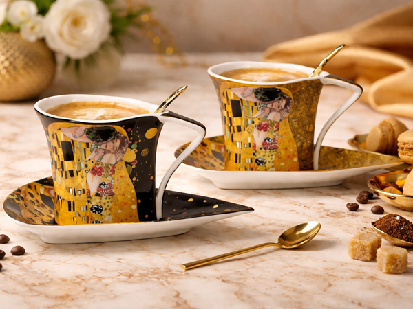 Šie porcelianiniai puodeliai išsiskiria ne tik forma, bet ir meniniu dizainu. Trikampė puodelių forma suteikia modernumo, o Klimto įkvėpti motyvai – prabangos pojūtį. Tai puikus pasirinkimas tiek kasdieniam naudojimui, tiek ypatingoms akimirkoms su svečiais.