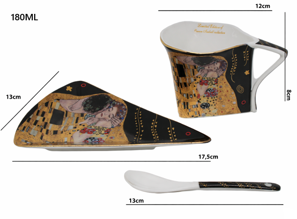 Išskirtinis porcelianinių puodelių rinkinys su trikampės formos puodeliais, lėkštutėmis ir šaukšteliais, dekoruotas garsaus menininko Gustavo Klimto kūrinių motyvais – tai elegancijos ir meno derinys jūsų namuose. Šis stilingas komplektas puikiai tinka kavai ar arbatai, o unikalus dizainas suteikia kasdieniam ritualui ypatingo žavesio.