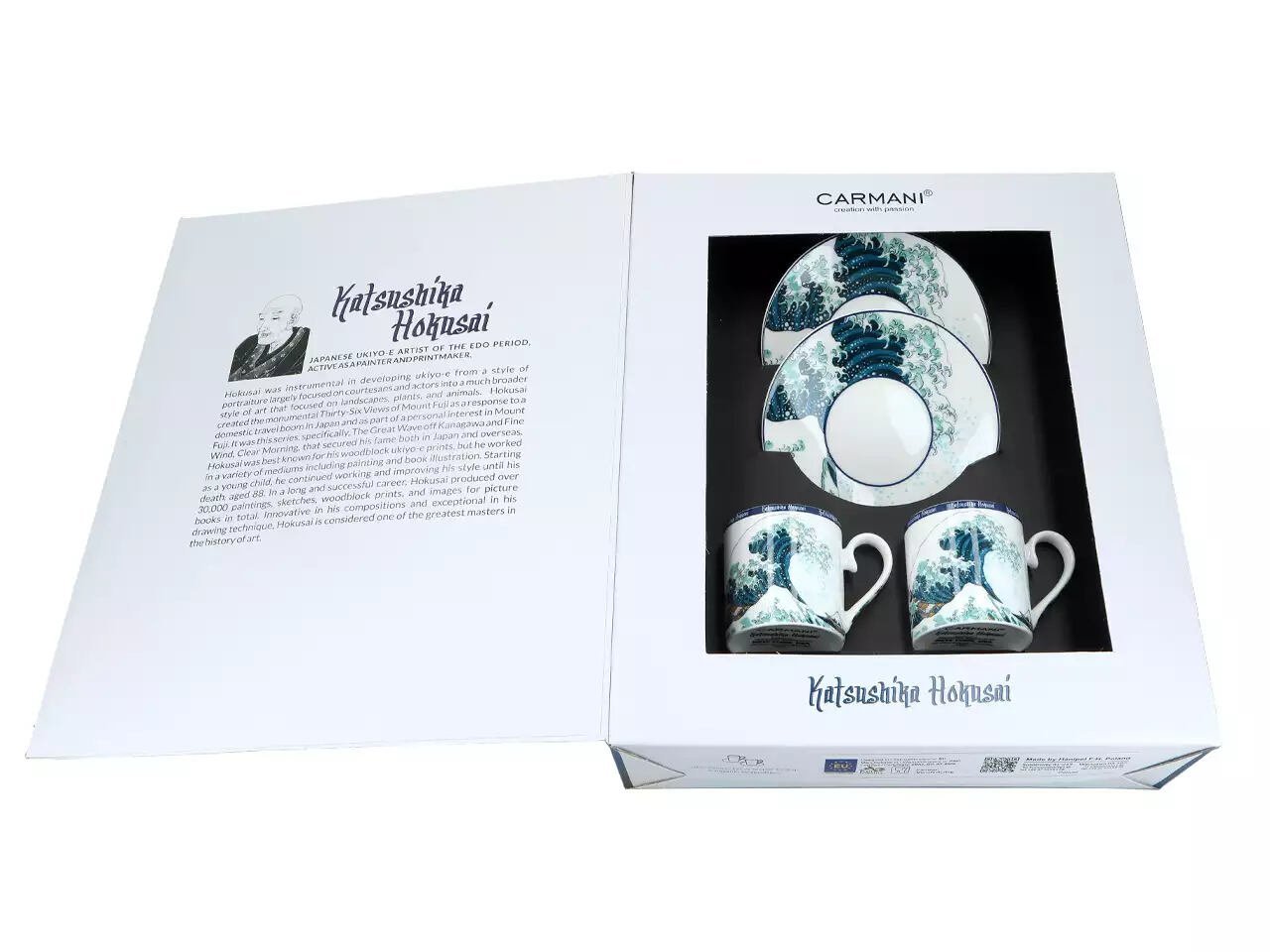 Carmani puodeliai kavai ir puodeliai espresso išsiskiria savo išskirtiniu dizainu, įkvėptu žymių menininkų, tokių kaip Alphonse Mucha, Gustav Klimt, ir Katsushika Hokusai, kūrinių. Kiekvienas puodelis kavai ir puodelis espresso yra meno kūrinys, kuris puikiai dera su šiuolaikiniais interjerais. Be to, Carmani puodeliai yra pagaminti iš aukštos kokybės porceliano, kuris užtikrina ilgaamžiškumą ir patogumą kasdieniam naudojimui.