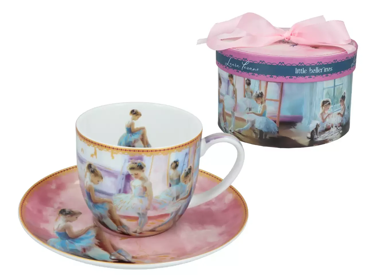 porcelianinis puodelis su lėkštute, mažosios balerinos, L. Lozano puodelis, porcelianas, dovana balerinos gerbėjai, elegantiškas puodelis, laikasarbatai.lt