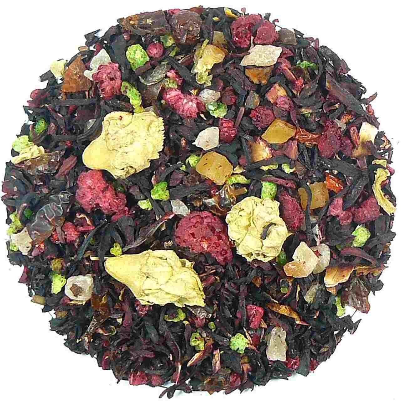 ✔ Tropiniai vaisiai (iki 50 %) – kandizuoti ananasai, citrinos, mangai, papajos ir liofilizuotos avietės suteikia arbatai natūralų saldumą ir gaivumą.