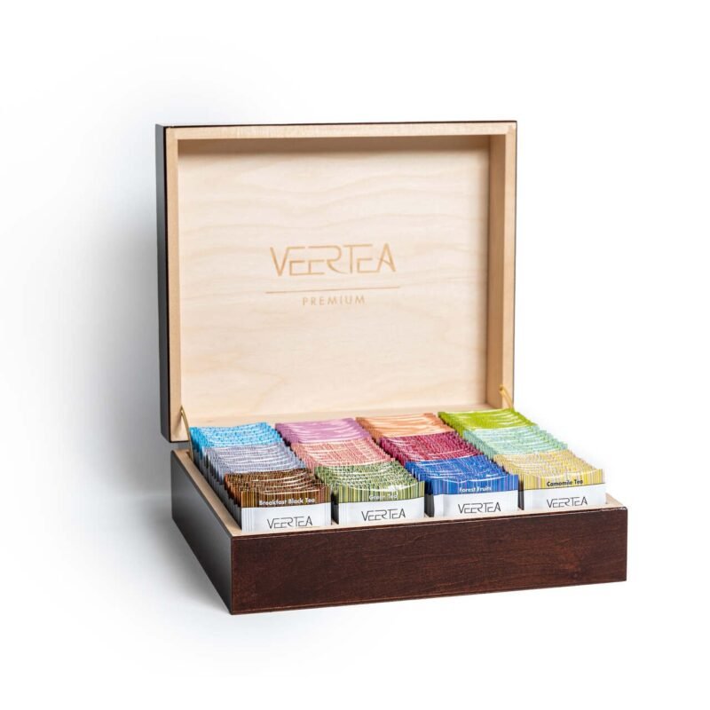 Elegantiškas “Veertea Premium” arbatos rinkinys, užpildytas arbatomis, 180 pakelių skirtingų skonių. Kiekvienas paketėlis supakuotas į atskirą vokeli. “Veertea Premium” rinkinys tinka ir kaip dovana mylimam žmogui, klientui ar kaip padėka. Tai taip pat puikus sprendimas viešbutyje, ofise ir namuose. Puikiai tinka tiek namams, tiek biurui.