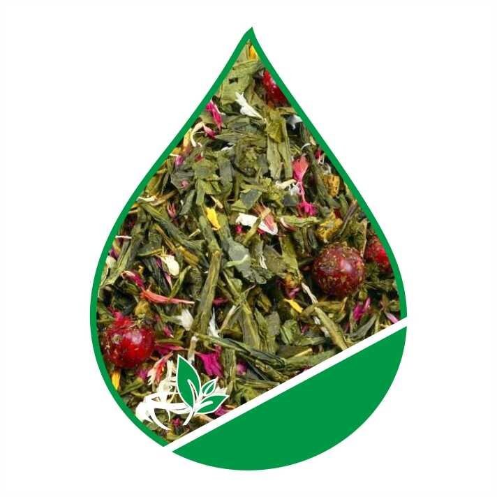 žalioji arbata, liofilizuotos abrikosas, liofilizuoti raudonieji serbentai, bajorė balsvoji, saulėgražų žiedlapiai, kvapioji medžiaga.