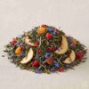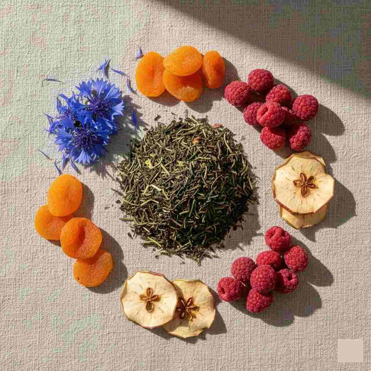 žalioji arbata, rugiagėlių žiedlapiai, liofilizuoti abrikosai, liofilizuotos avietės, džiovinti obuoliai, kvapioji medžiaga.