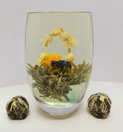 Švelniai užpilkite karštu vandeniu ant arbatos kamuoliuko, stengdamiesi nepakenkti jo formai. Stebėkite, kaip jis išsiskleidžia į gražią žiedų kompoziciją.Leiskite pritraukti